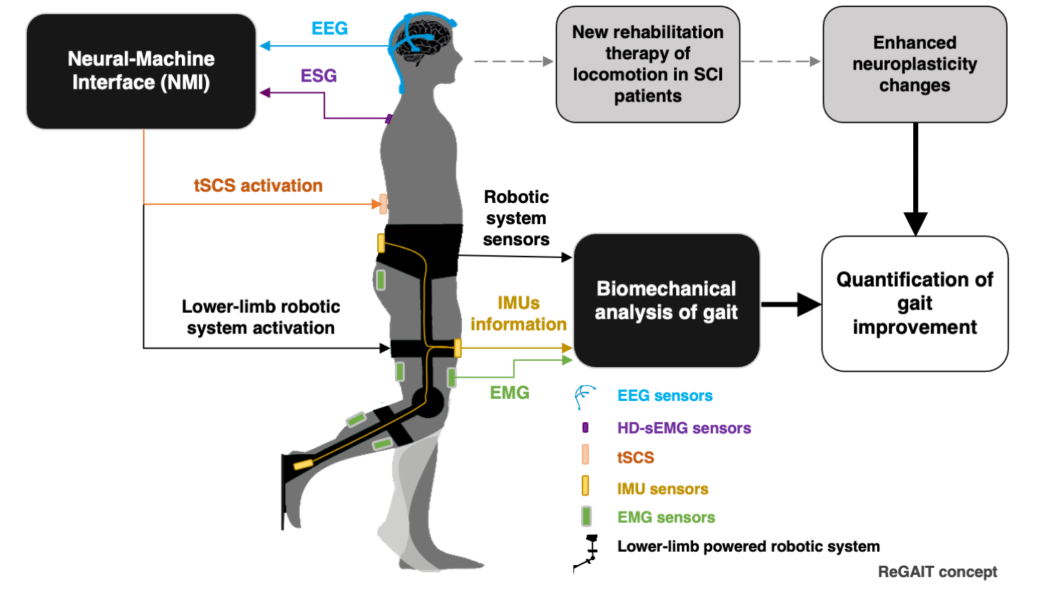 ReGAIT: A new rehabilitation approach of locomotion for incomplete spinal cord injury patients by integrating neural interfaces, lower-limb powered robotic systems and transcutaneous spinal current stimulation strategies